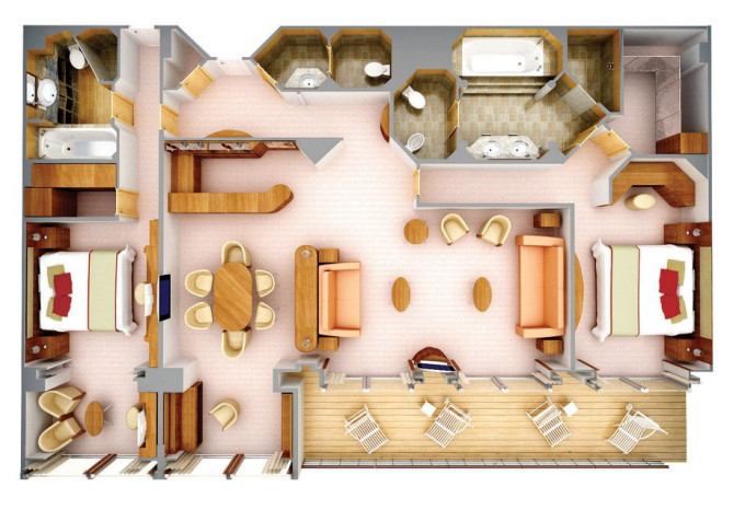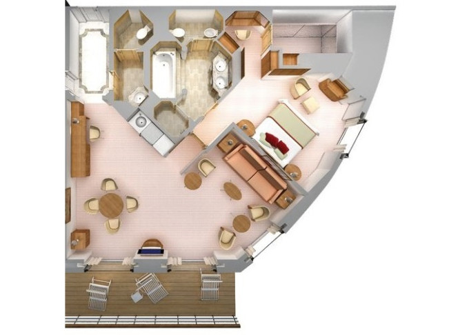 | R2 - Royal Suite 2 127 m² (vrátane 18 m² balkónov). Royal Suite prepojená s Veranda Suite. 7. paluba vpredu. Max 5 osôb. | 65 200 € 16 300 € za osobu |